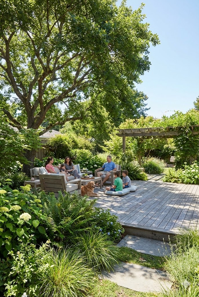 休日の朝、ウッドデッキでコーヒーを飲む。子どもたちが芝生の上を走り回る。夜はライトアップされた庭を眺めながら、ゆったりと過ごす。